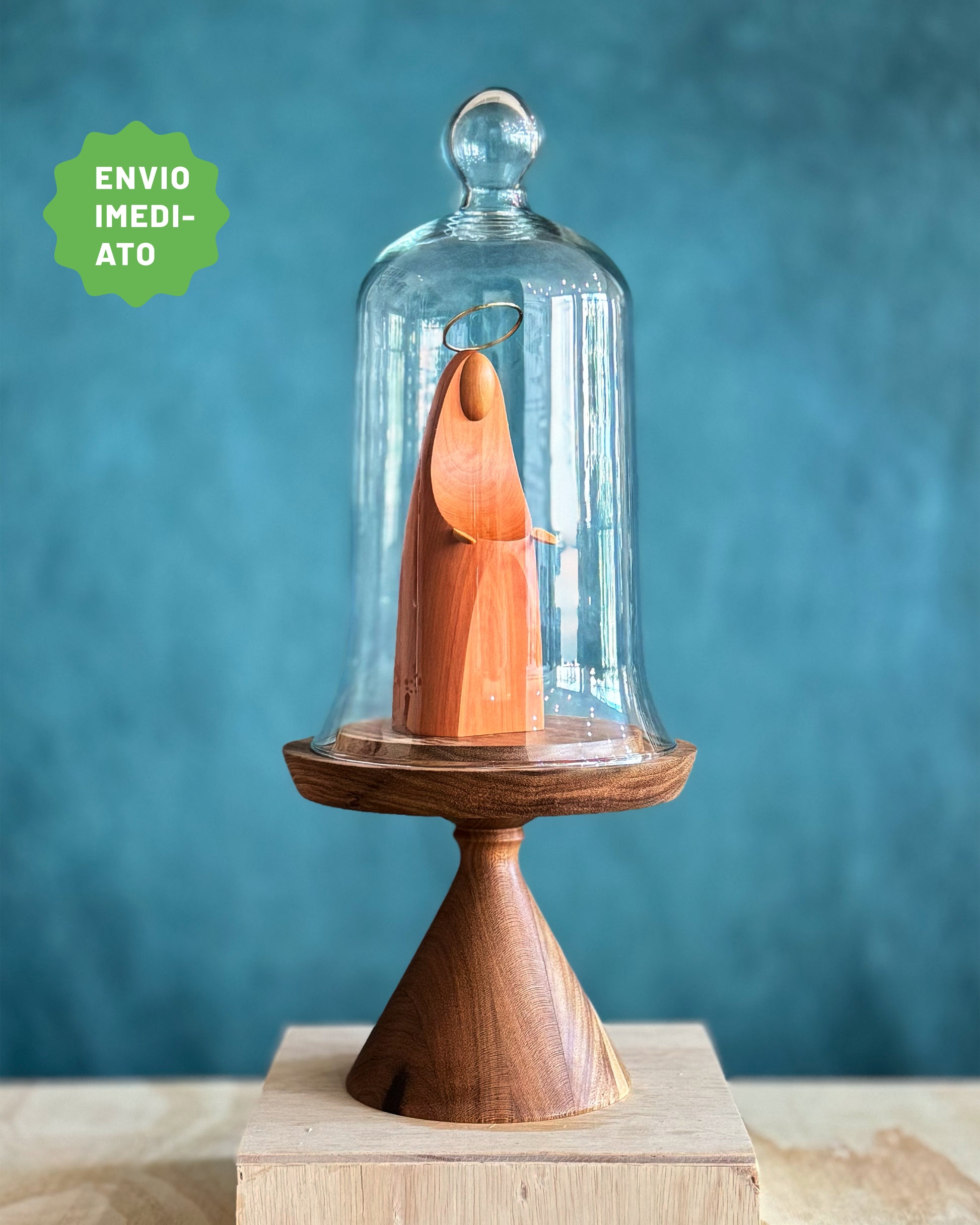 Produzida em madeiras de peroba-rosa, com auréola em cobre. Redoma produzida em imbuia.