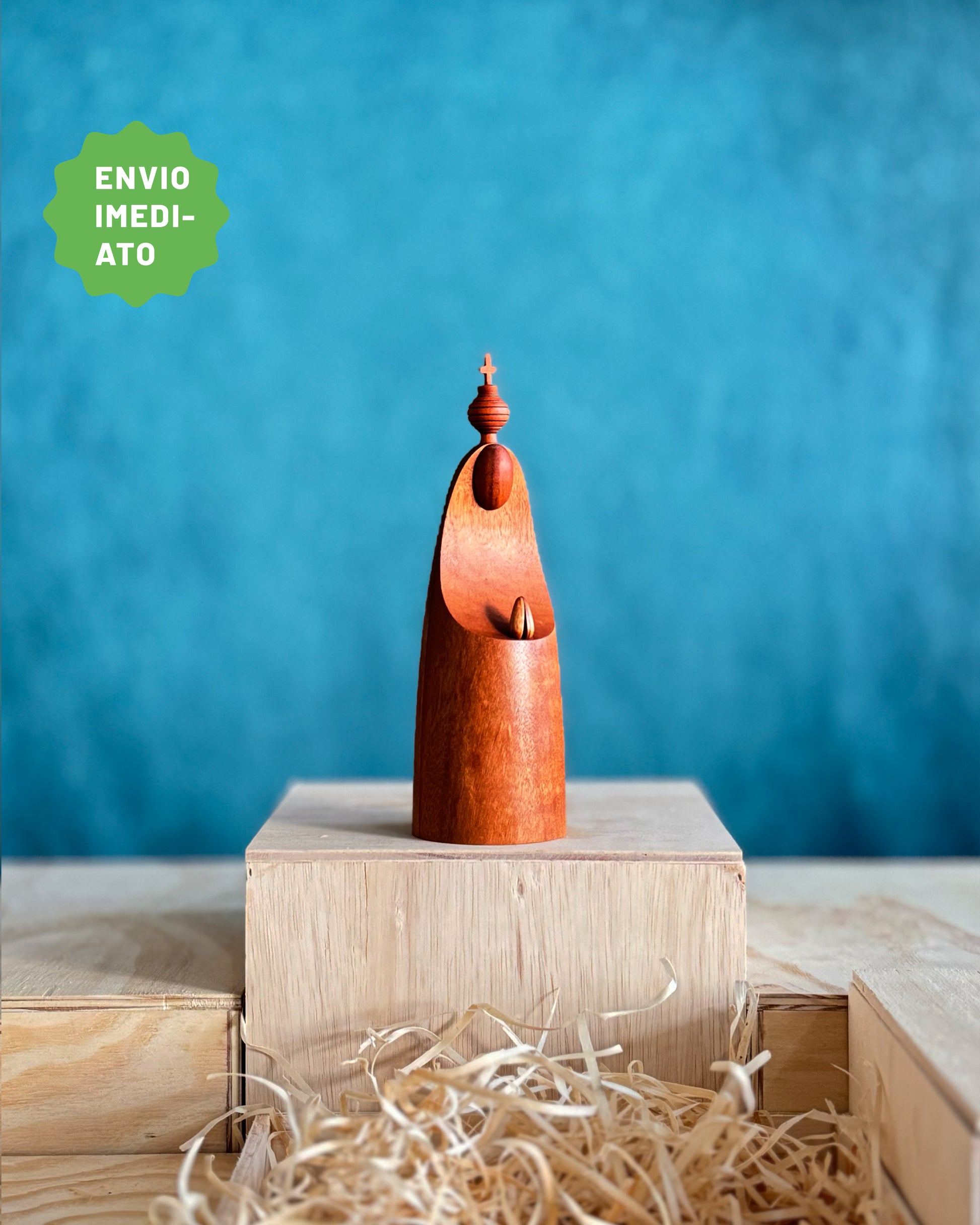 Produzida em madeiras de maracatiara. Coroa produzida somente em madeira de peroba-rosa.