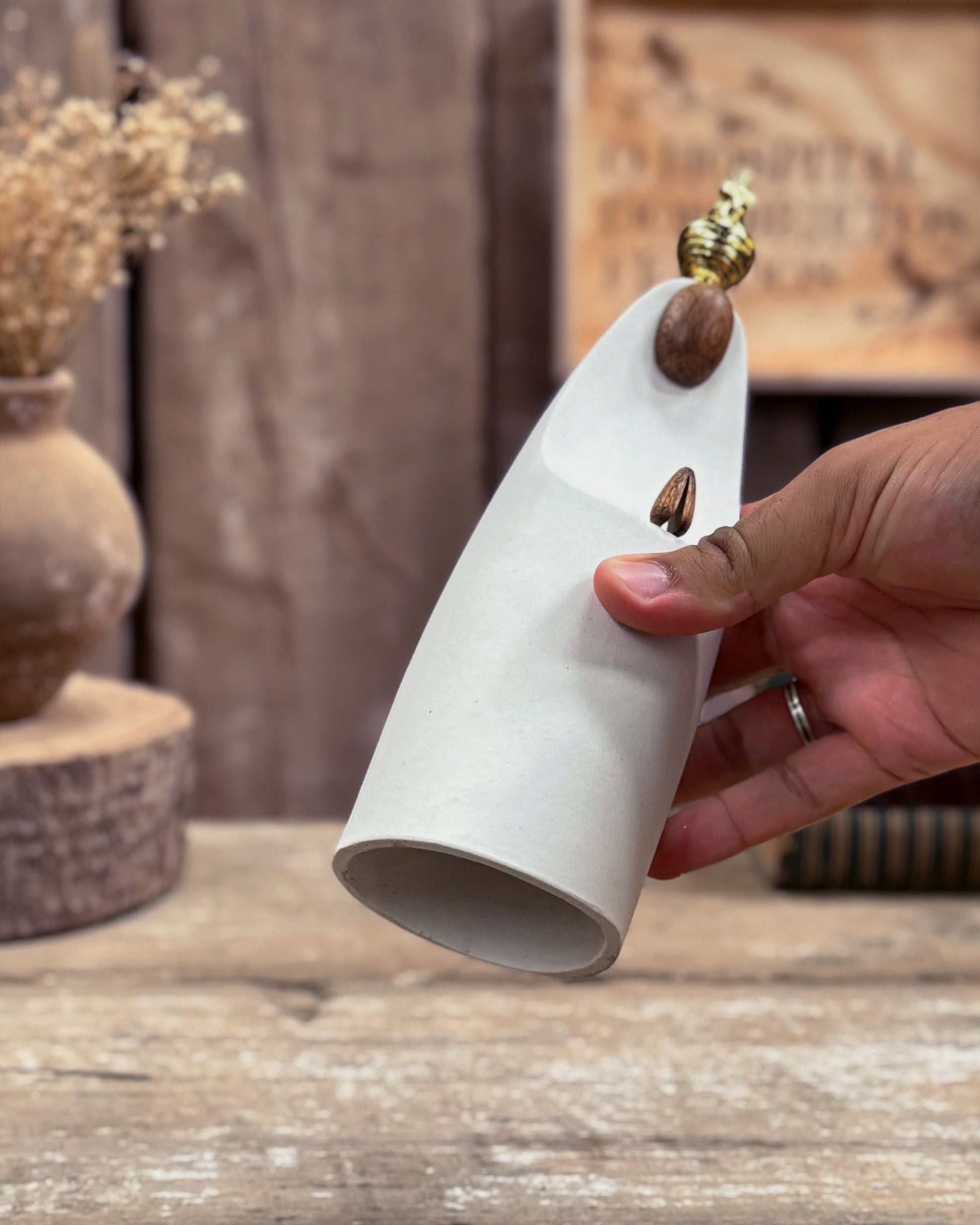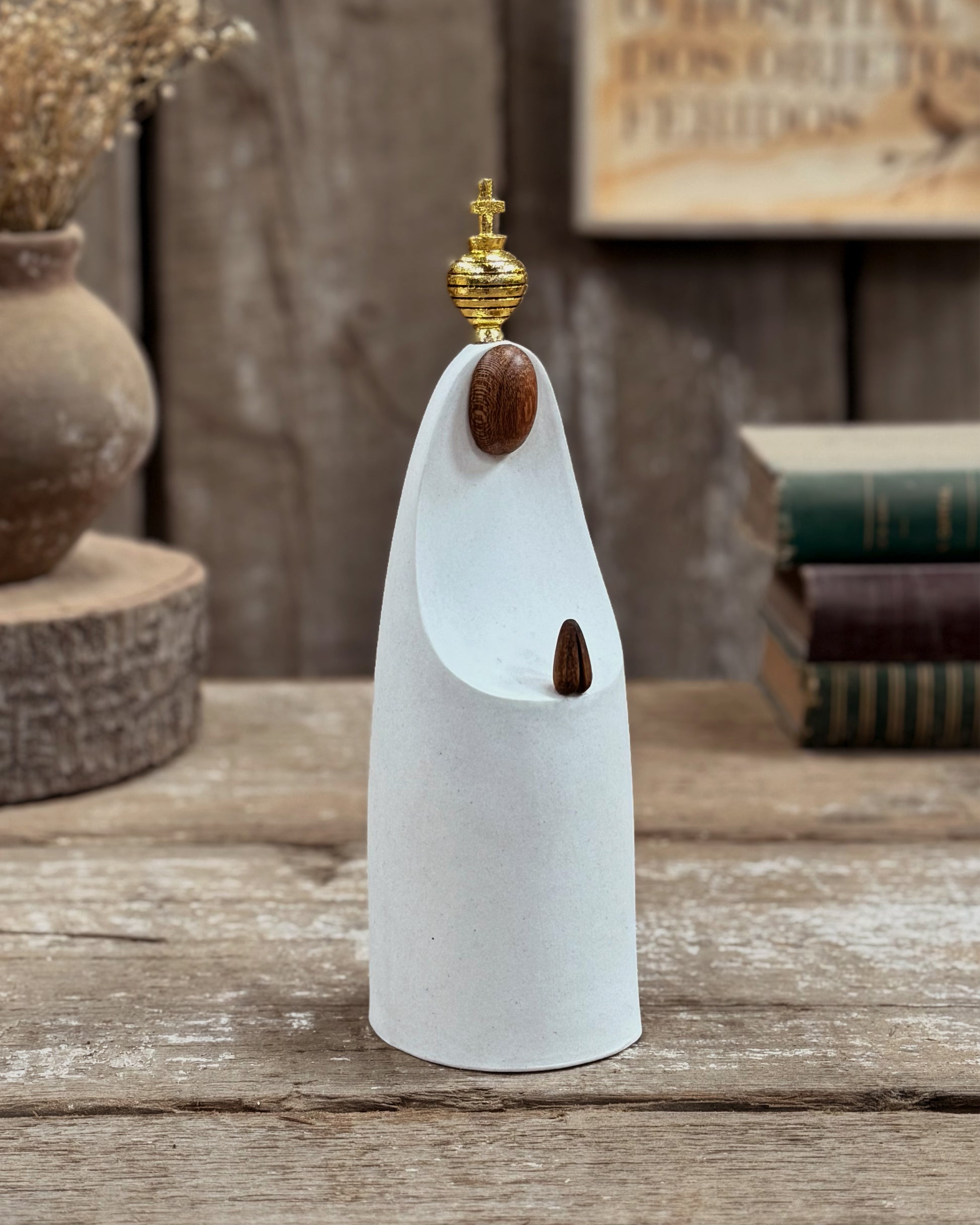 Produzida em cerâmica branca , com rosto e mãos em freijó, coroa em detalhe dourada.