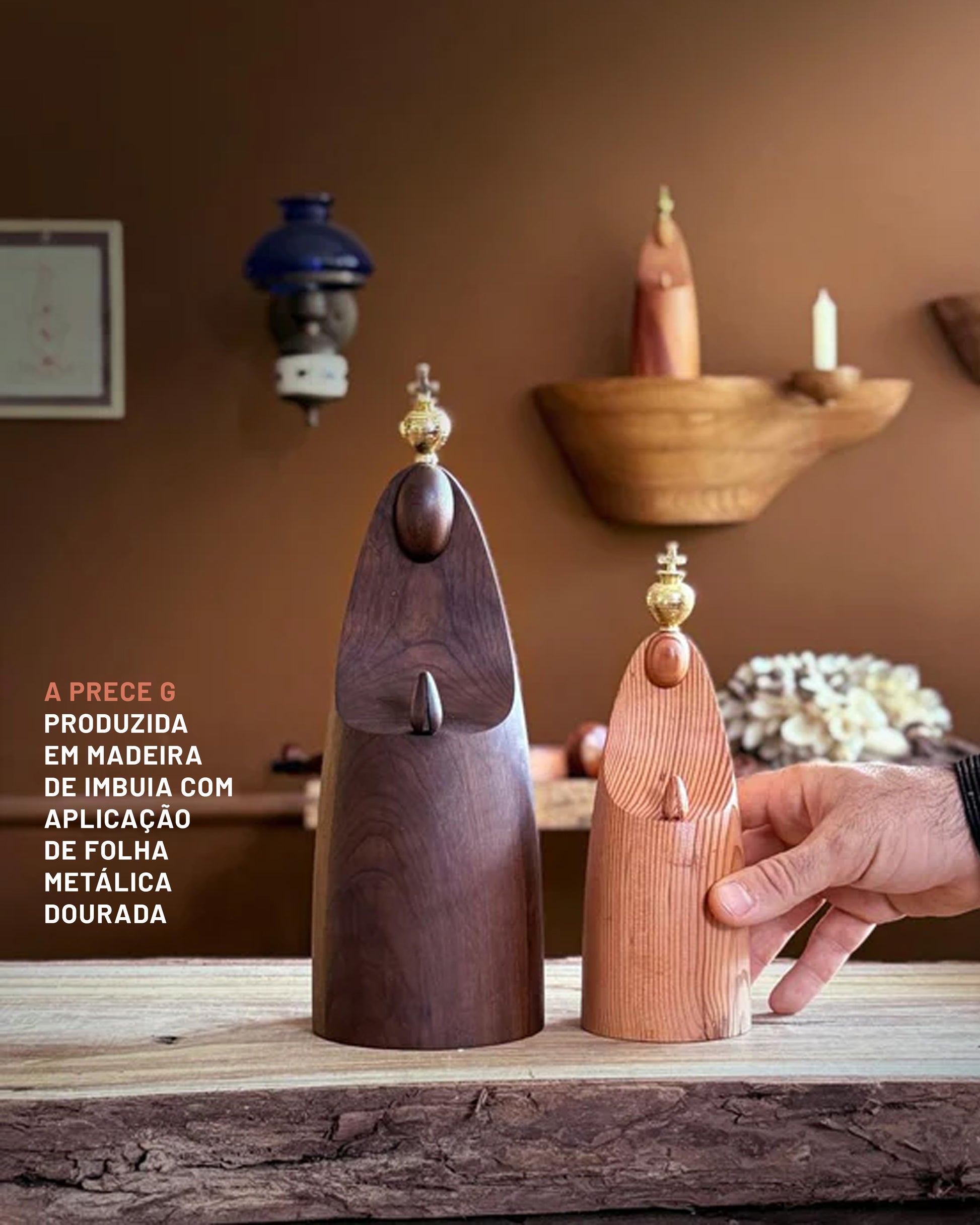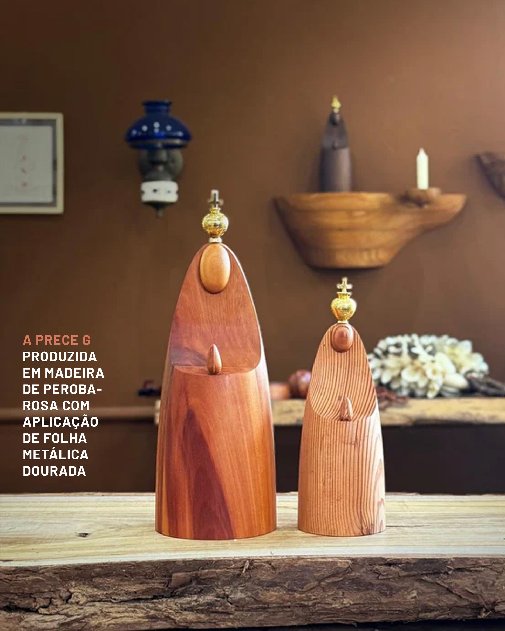 Produzida em madeiras de peroba-rosa e imbuia com detalhe em folha metálica dourada.