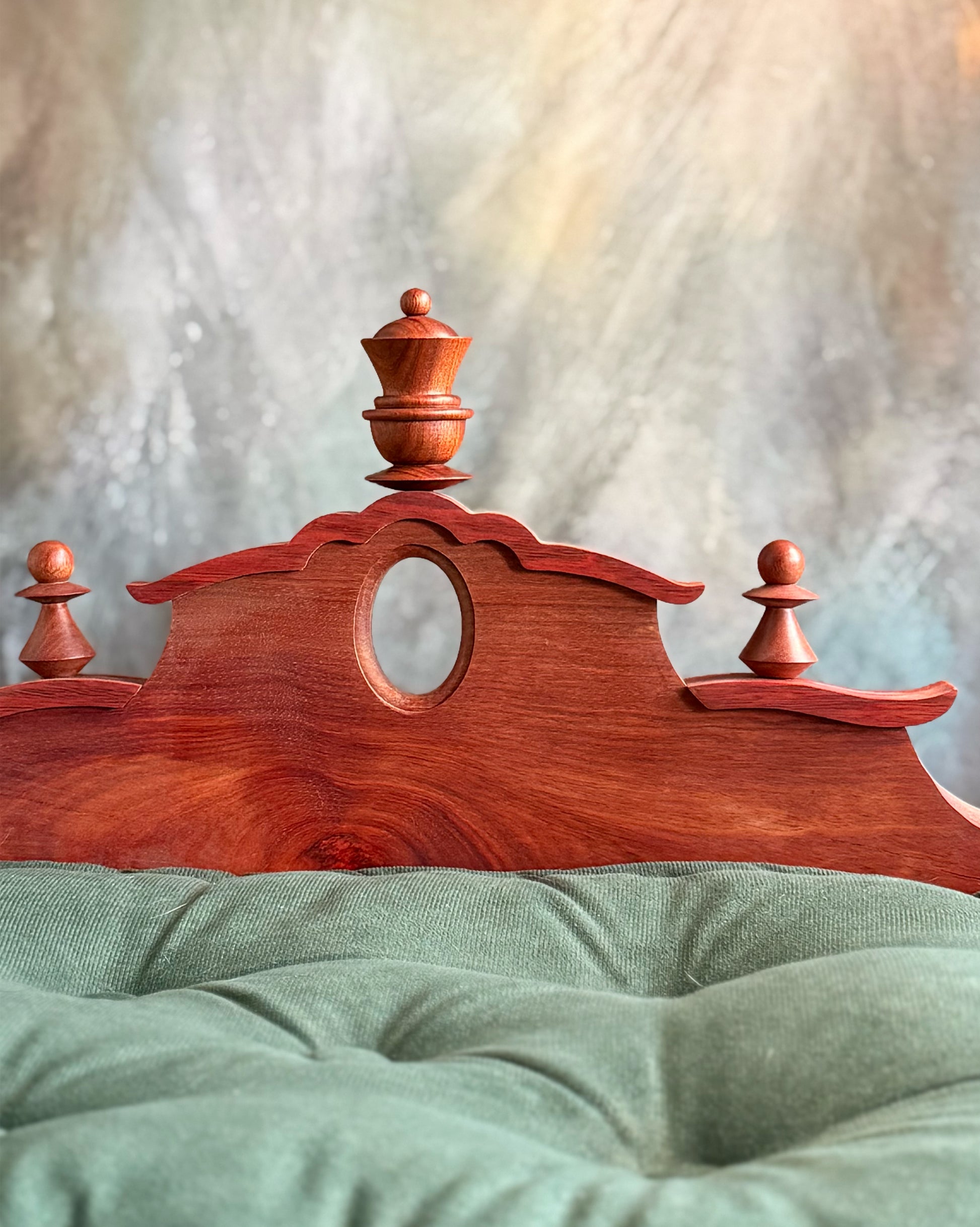 Produzida em madeira de muirapiranga com almofada de veludo verde. Acompanha embalagem para presente.