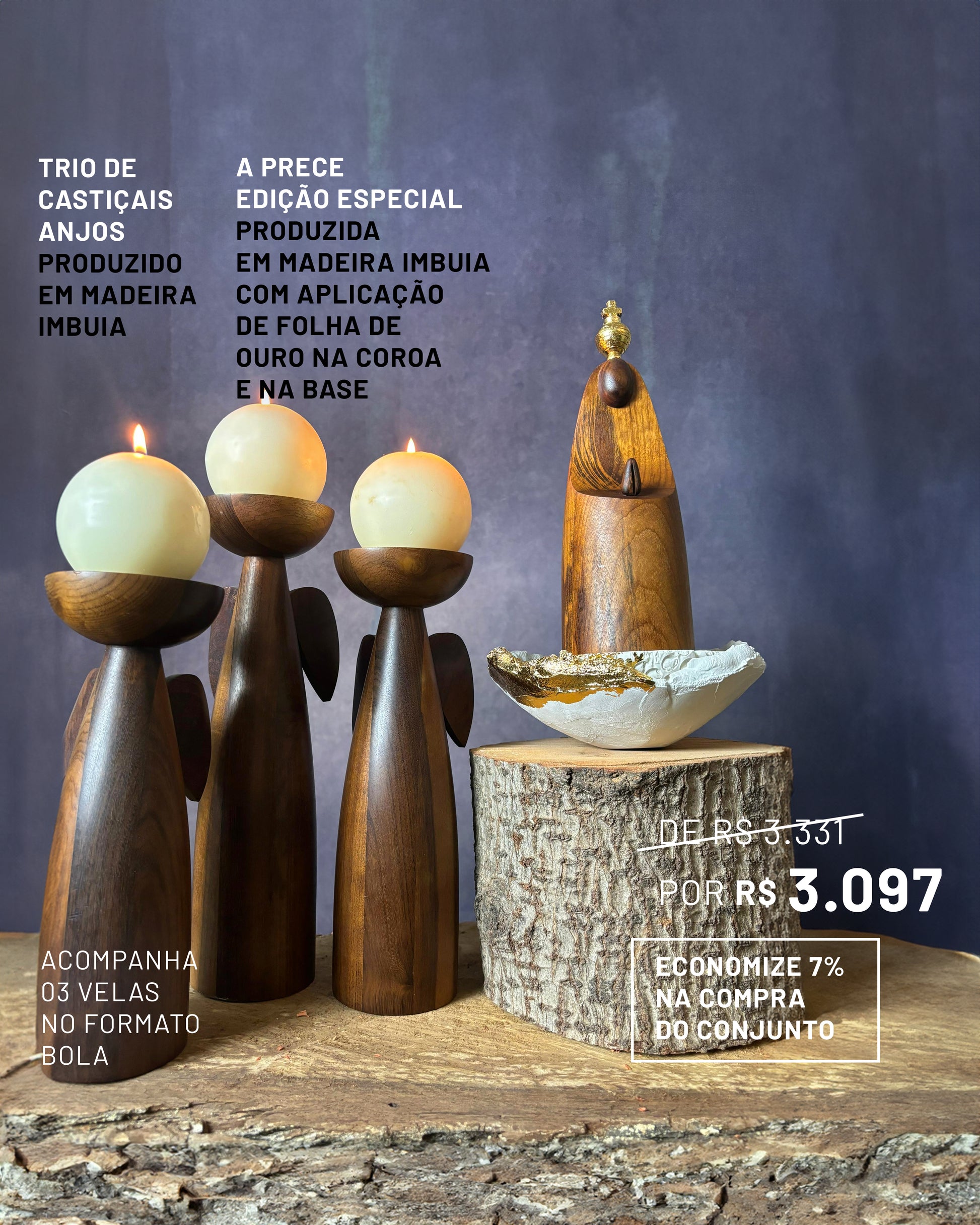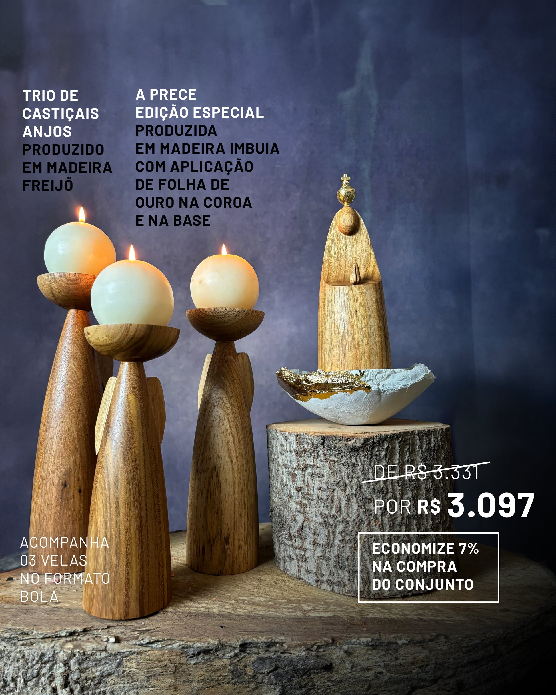 Conjunto composto por 1 escultura A Prece Edição Especial em madeira de freijó ou imbuia com aplicação de folha metálica dourada na coroa, base em concreto com aplicação de folha metálica dourada, 3 Castiçais Anjos com Asas em madeira de freijó ou imbuia e 3 velas no formato bola.
