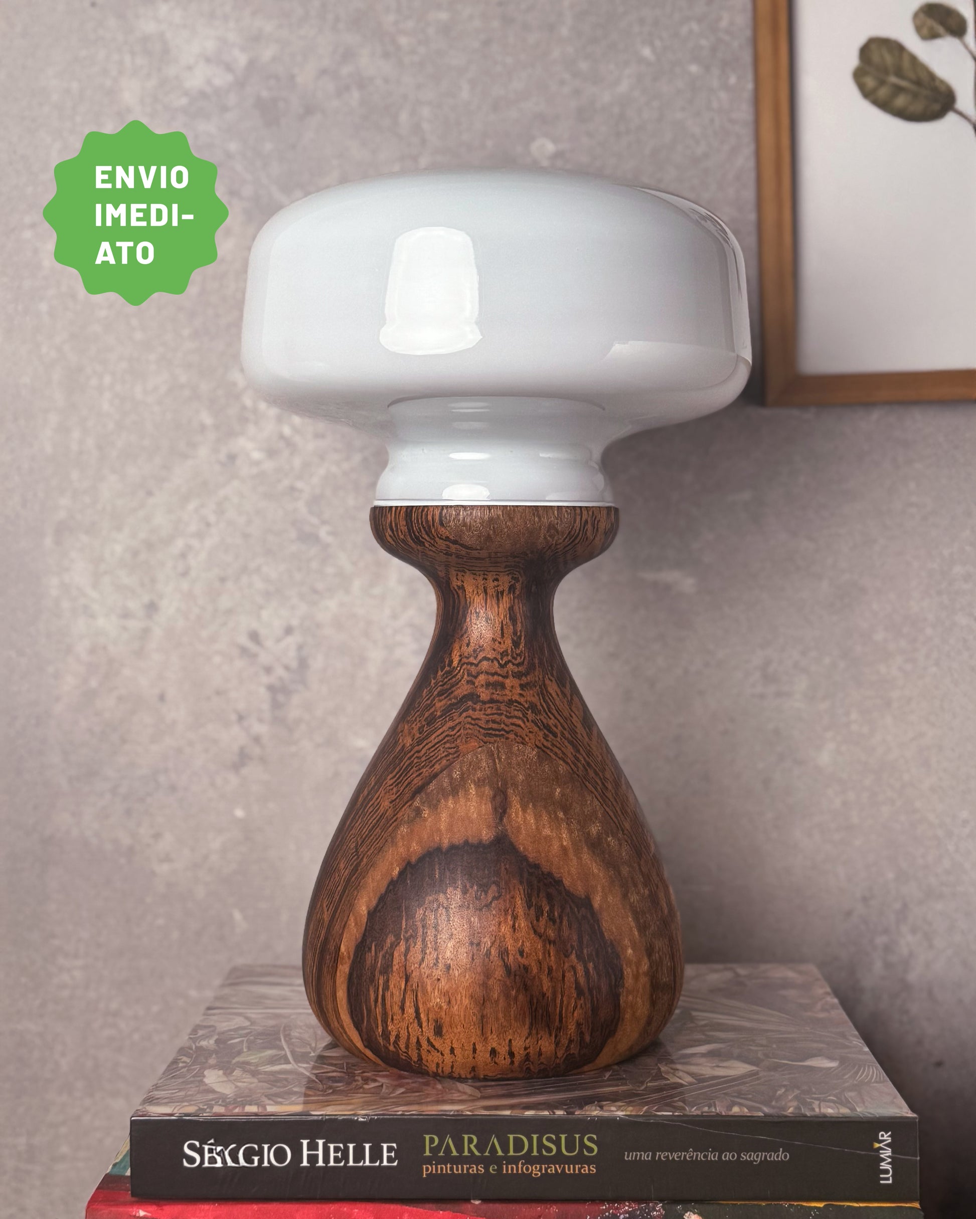 Produzida em madeiras de imbuia. Acompanham cúpula de vidro jateado leitoso, lâmpada e fiação bivolt.