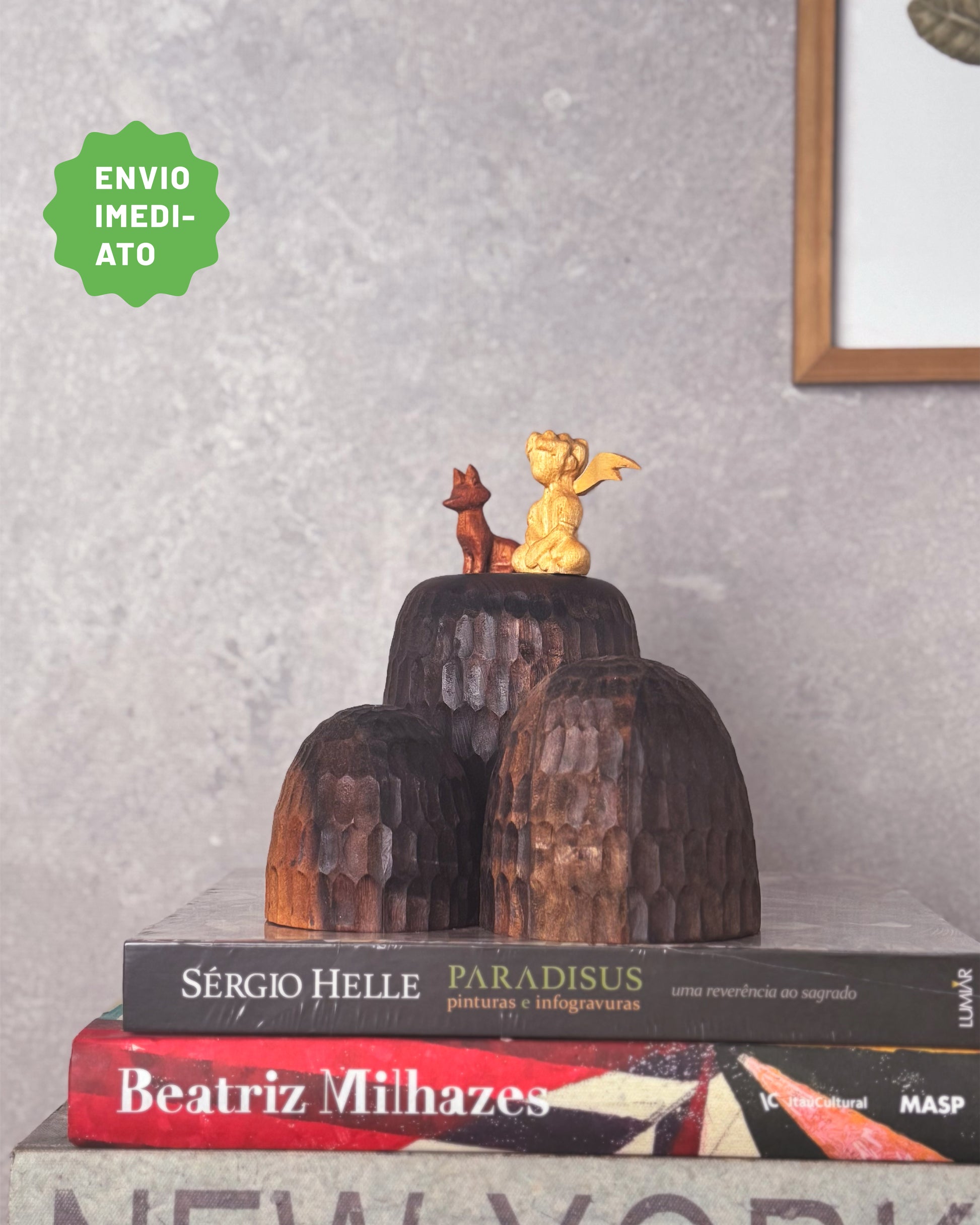 Montanhas produzidas em madeira de imbuia, Pequeno Príncipe produzido em madeira de marupá e Raposa produzida em madeira de peroba-rosa.