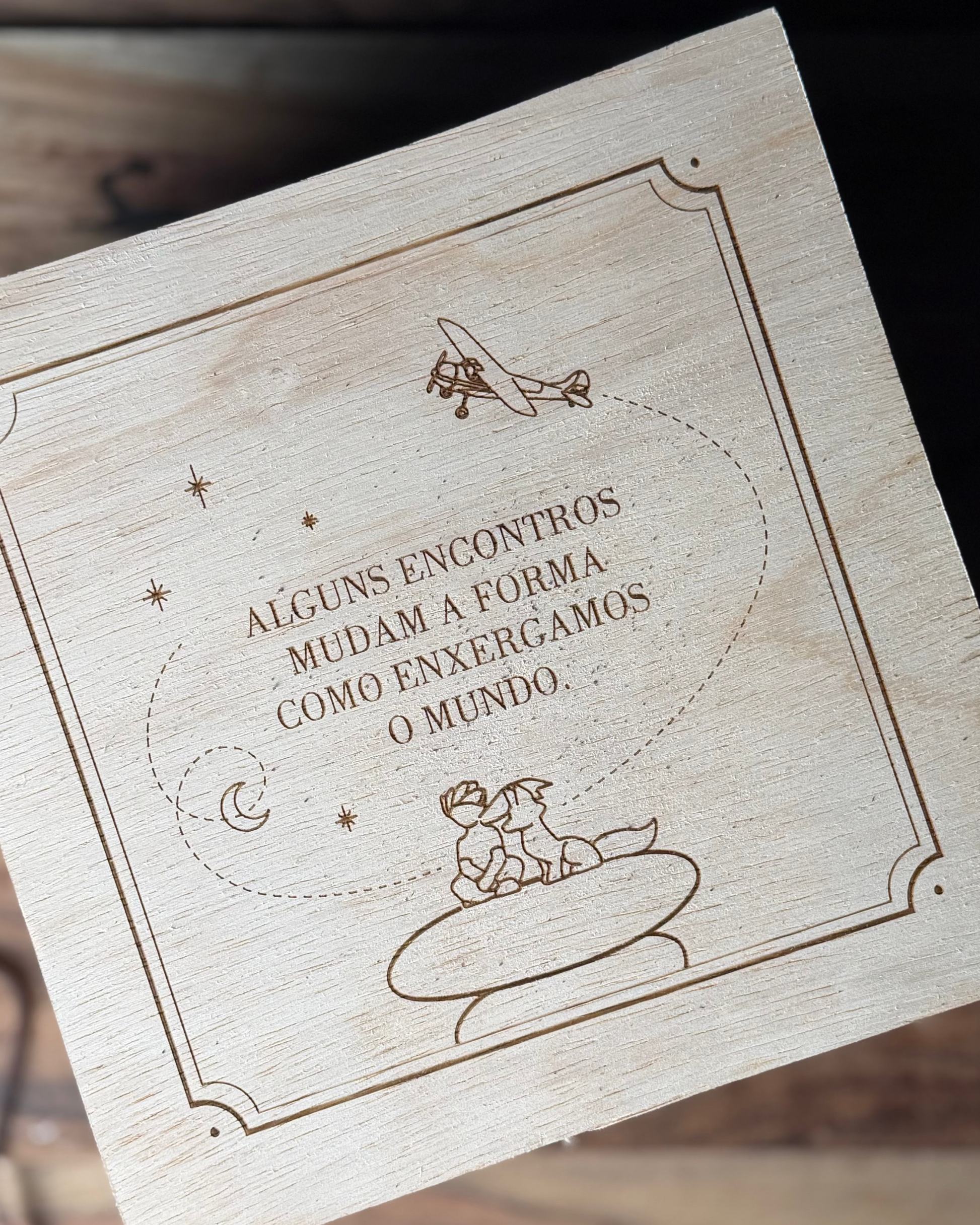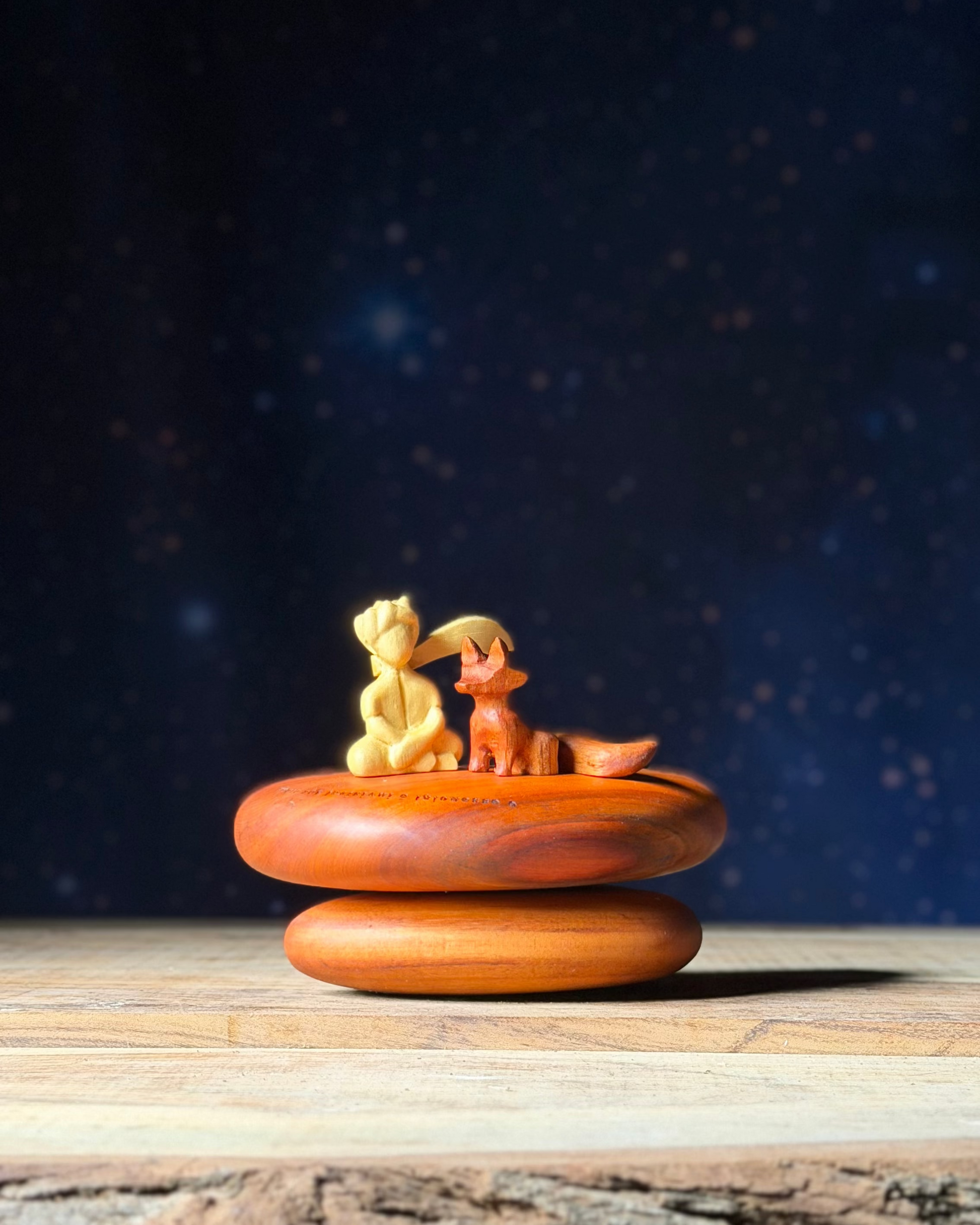 Montanhas produzidas em madeira de peroba-rosa e pinho-de-riga, Pequeno Príncipe produzido com madeira de marupá e Raposa produzida em madeira de cedro-rosa. Acompanha embalagem para presente.