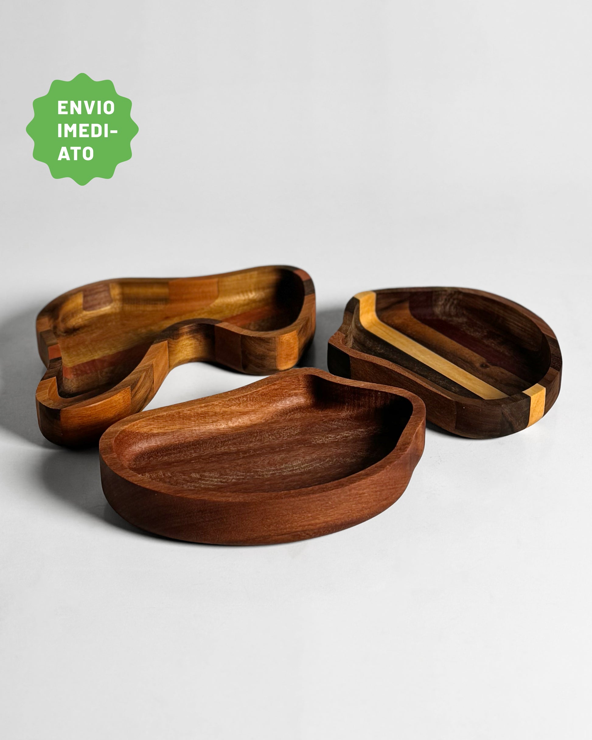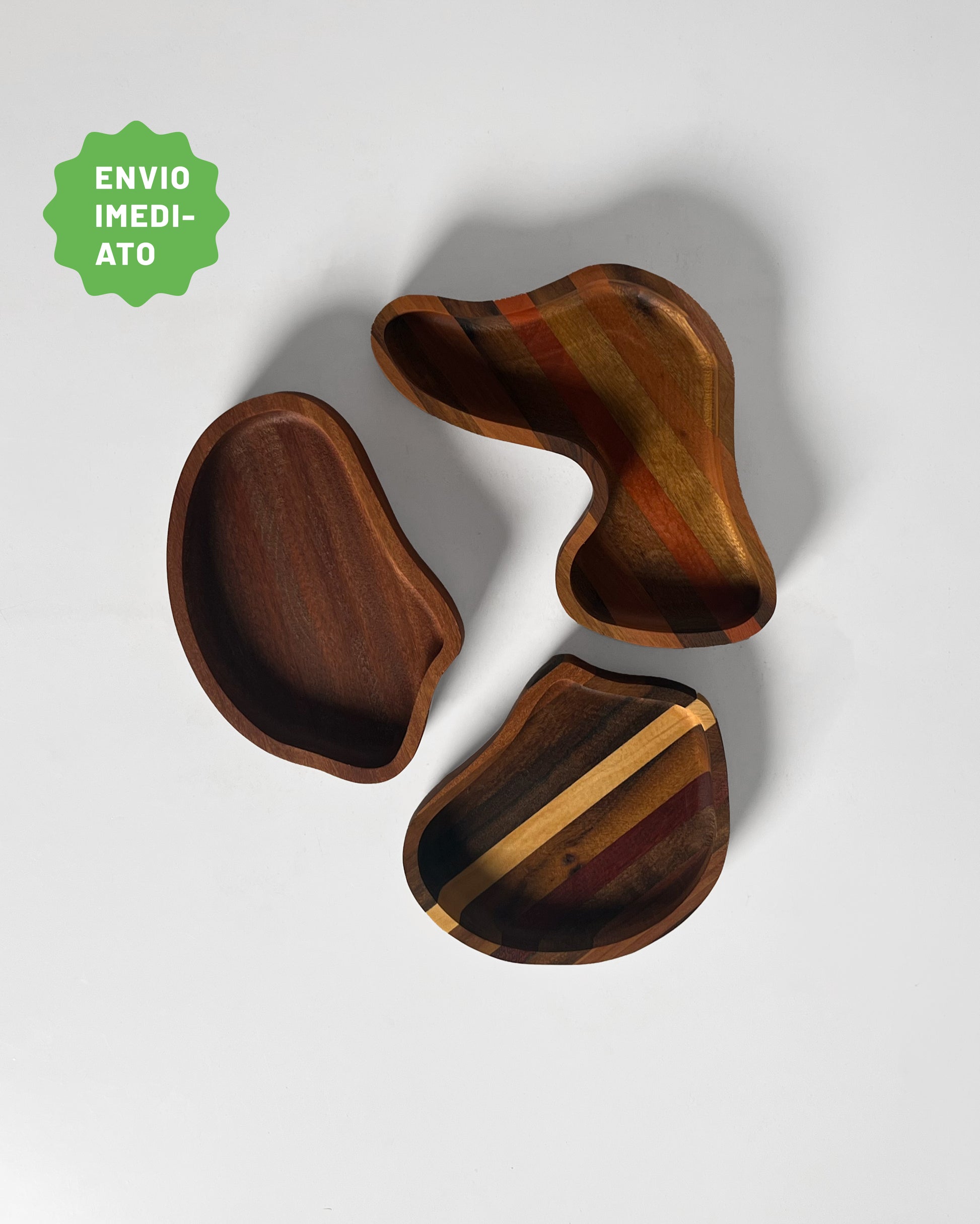 Todas as peças das série "Organoides de servir" são produzidas dentro de um conceito de Economia Circular. Por se tratarem de peças feitas a partir do aproveitamento de madeira, elas são cortadas de acordo com o formato da sobra de madeira. Ou seja, todas as peças são únicas e iguais as da foto.