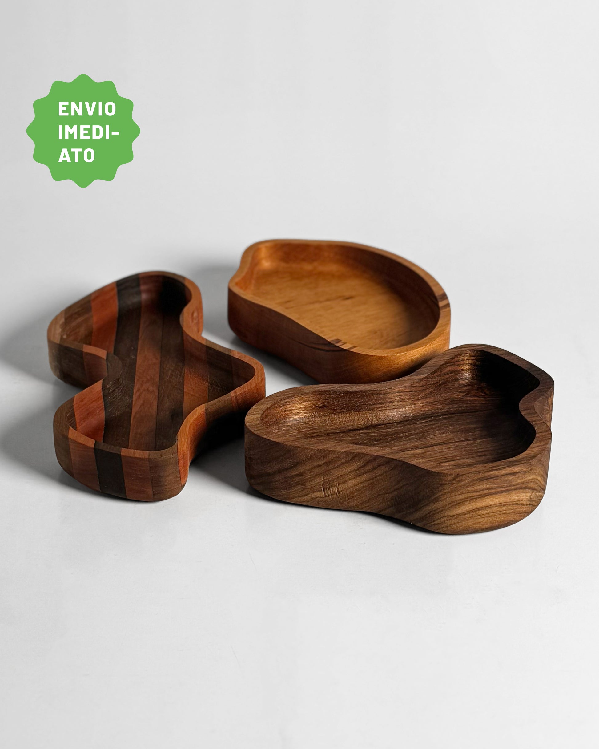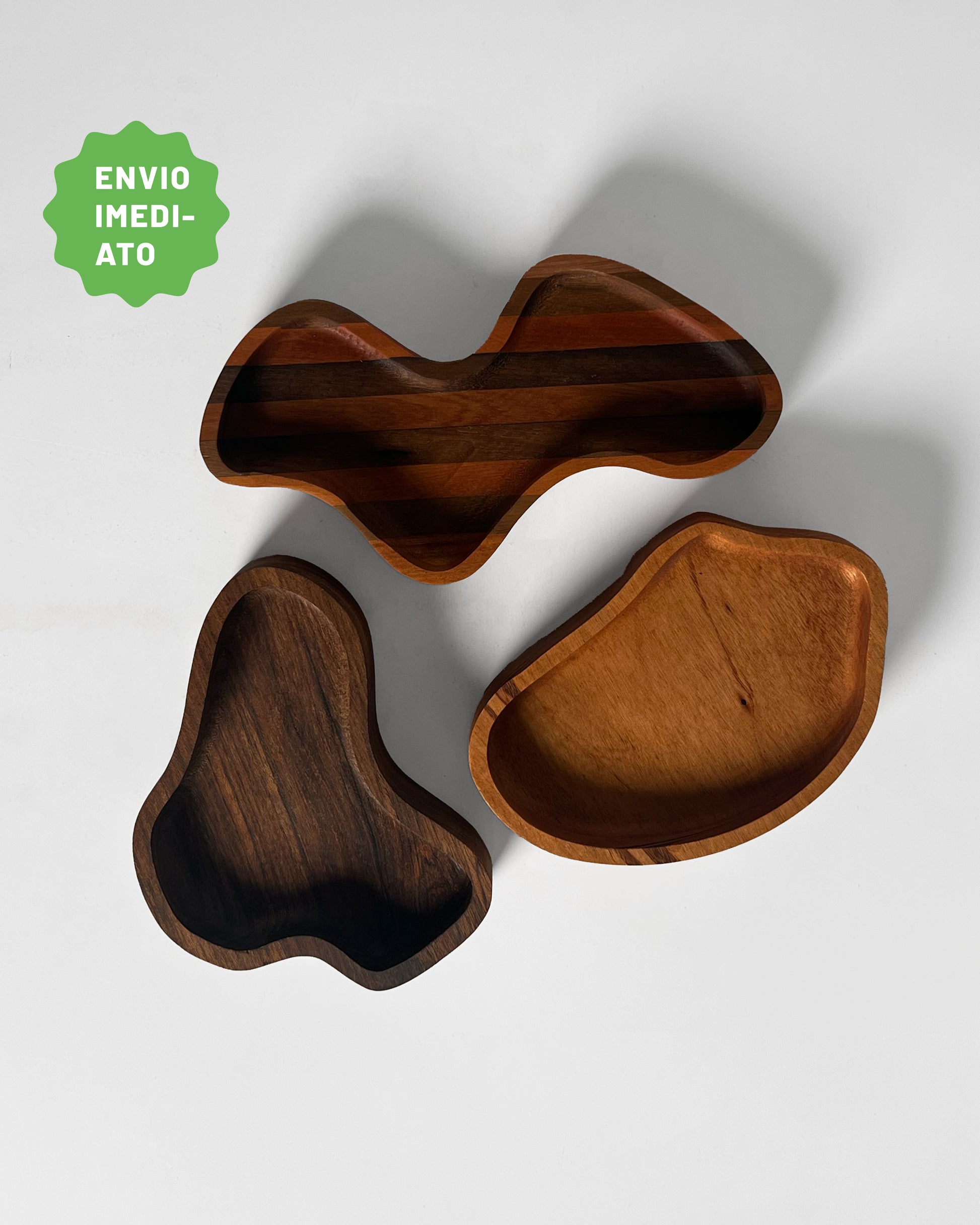 Todas as peças das série "Organoides de servir" são produzidas dentro de um conceito de Economia Circular. Por se tratarem de peças feitas a partir do aproveitamento de madeira, elas são cortadas de acordo com o formato da sobra de madeira. Ou seja, todas as peças são únicas e iguais as da foto.