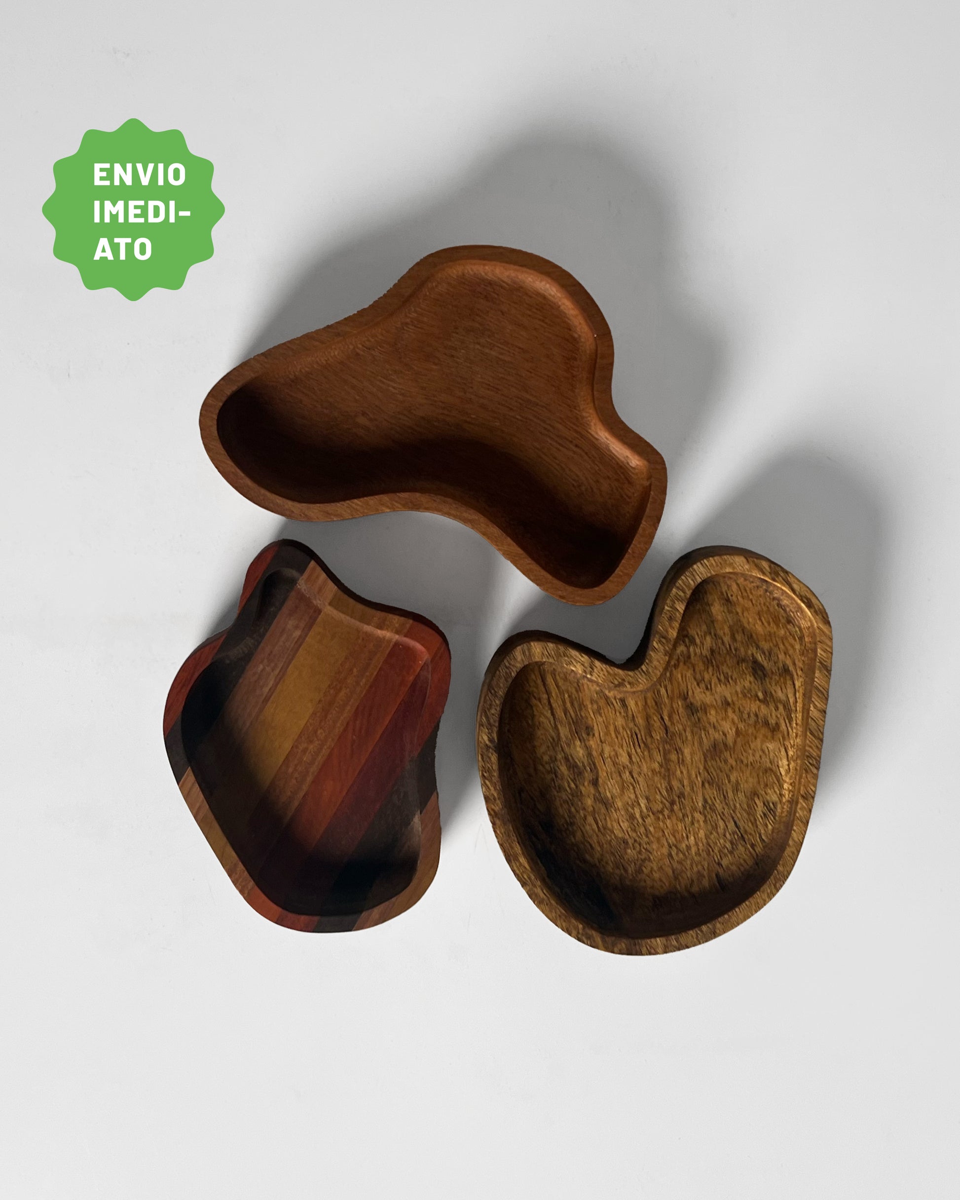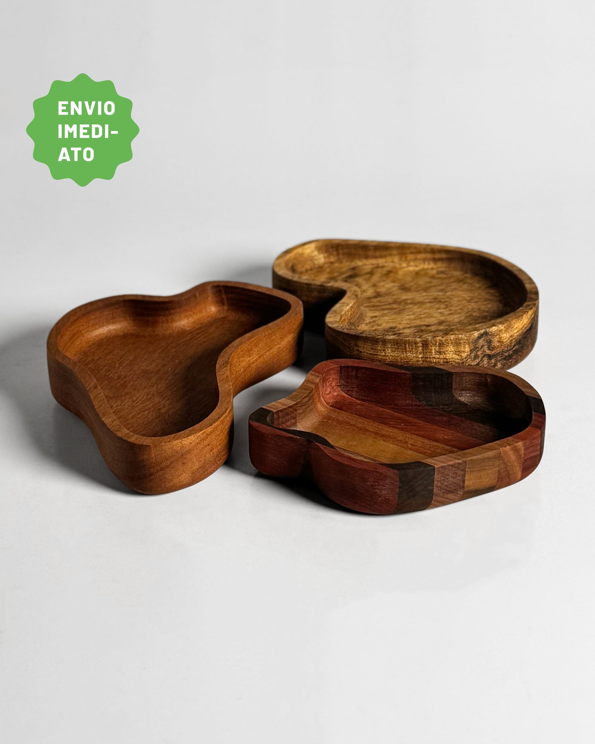 Todas as peças das série "Organoides de servir" são produzidas dentro de um conceito de Economia Circular. Por se tratarem de peças feitas a partir do aproveitamento de madeira, elas são cortadas de acordo com o formato da sobra de madeira. Ou seja, todas as peças são únicas e iguais as da foto.