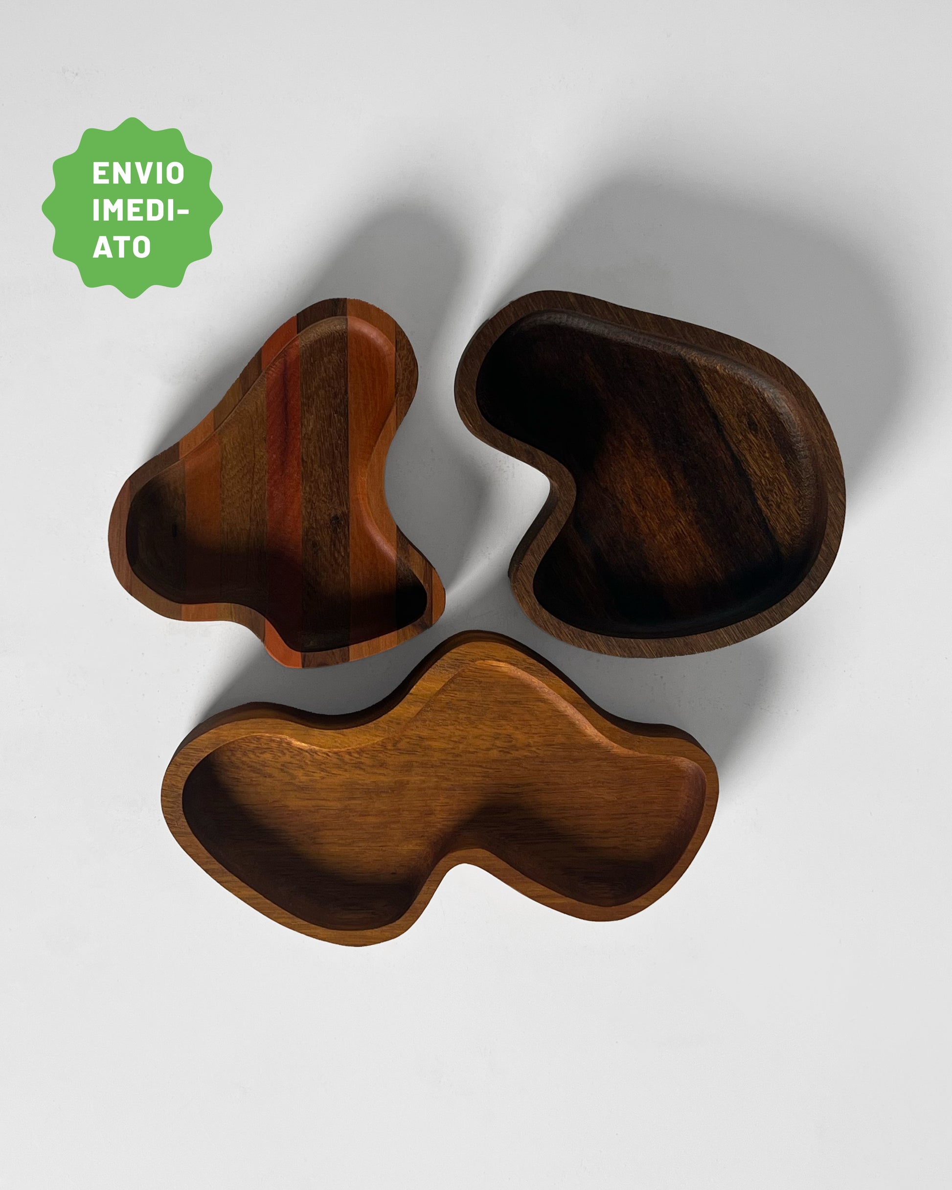 Todas as peças das série "Organoides de servir" são produzidas dentro de um conceito de Economia Circular. Por se tratarem de peças feitas a partir do aproveitamento de madeira, elas são cortadas de acordo com o formato da sobra de madeira. Ou seja, todas as peças são únicas e iguais as da foto.