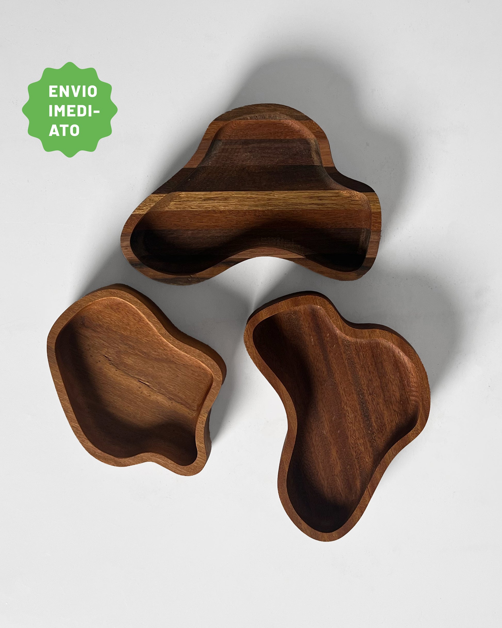 Todas as peças das série "Organoides de servir" são produzidas dentro de um conceito de Economia Circular. Por se tratarem de peças feitas a partir do aproveitamento de madeira, elas são cortadas de acordo com o formato da sobra de madeira. Ou seja, todas as peças são únicas e iguais as da foto.