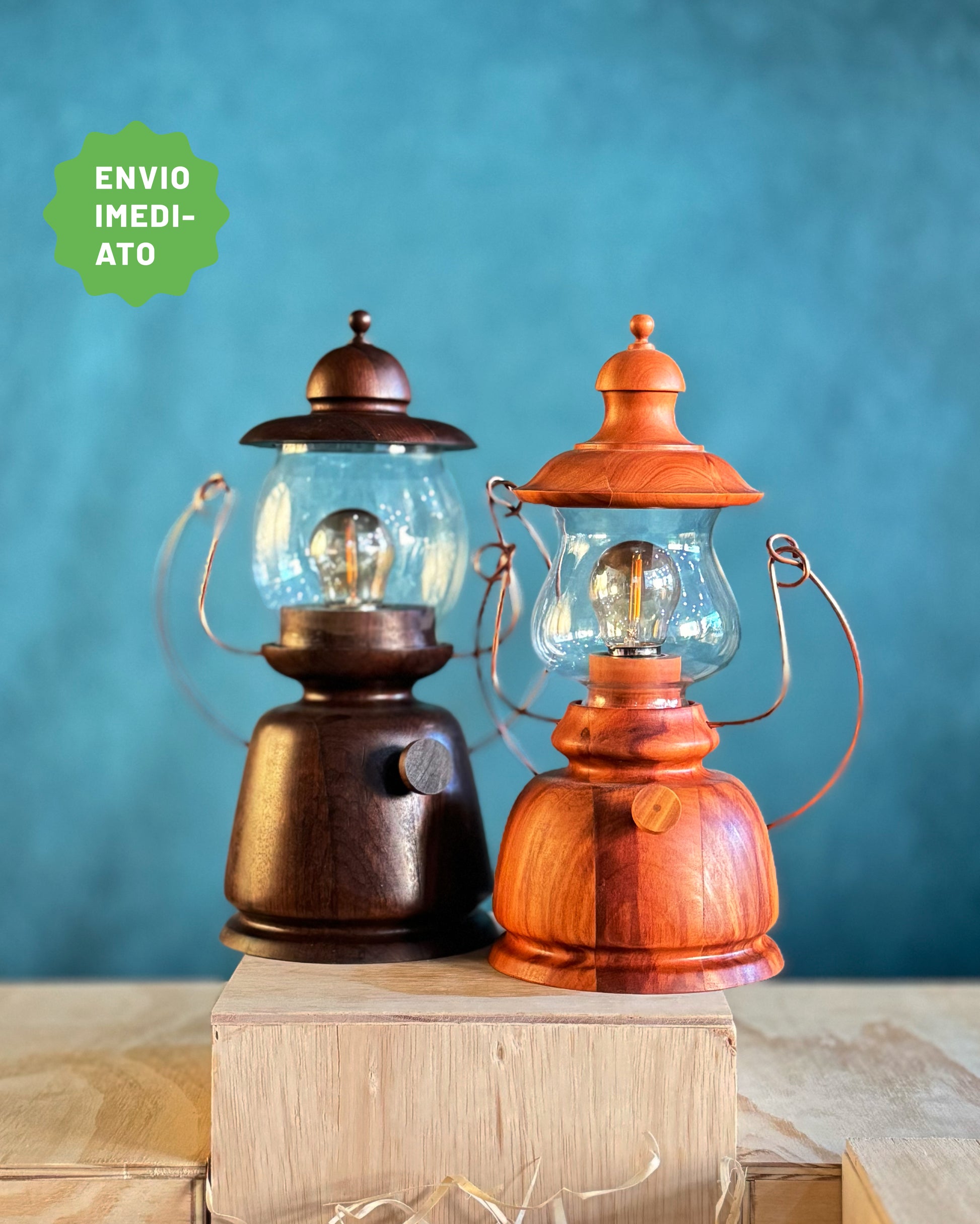 Par de Luminárias Lampião, produzida em madeira de imbuia com cúpula de vidro, e Maria Bonita, produzida em peroba-rosa com cúpula de vidro.
