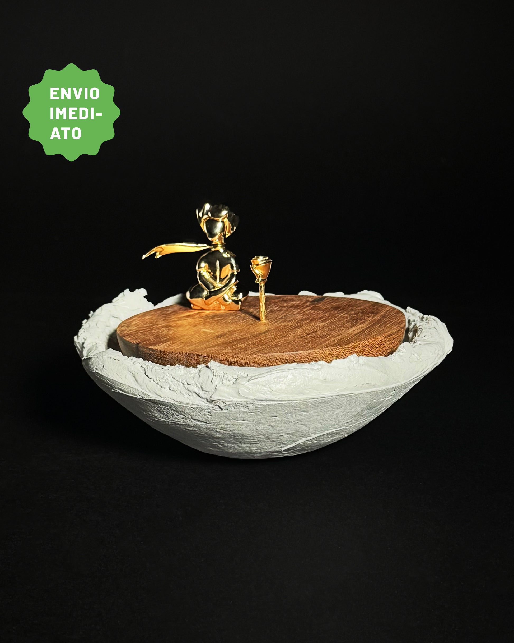 Pequeno Príncipe e rosa produzidos em metal banhado em dourado. Base produzida em madeira de Freijó, fragmento em concreto.