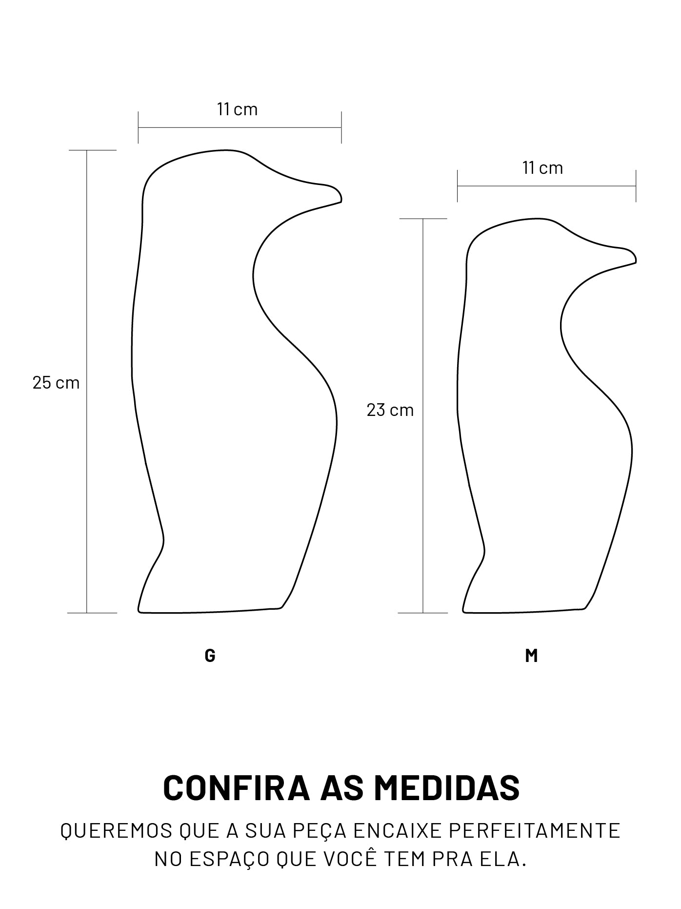 Produzido em madeiras de imbuia e pau-marfim, nos tamanhos M e G. A opção Par é composta por dois pinguins, nos tamanhos M e G.