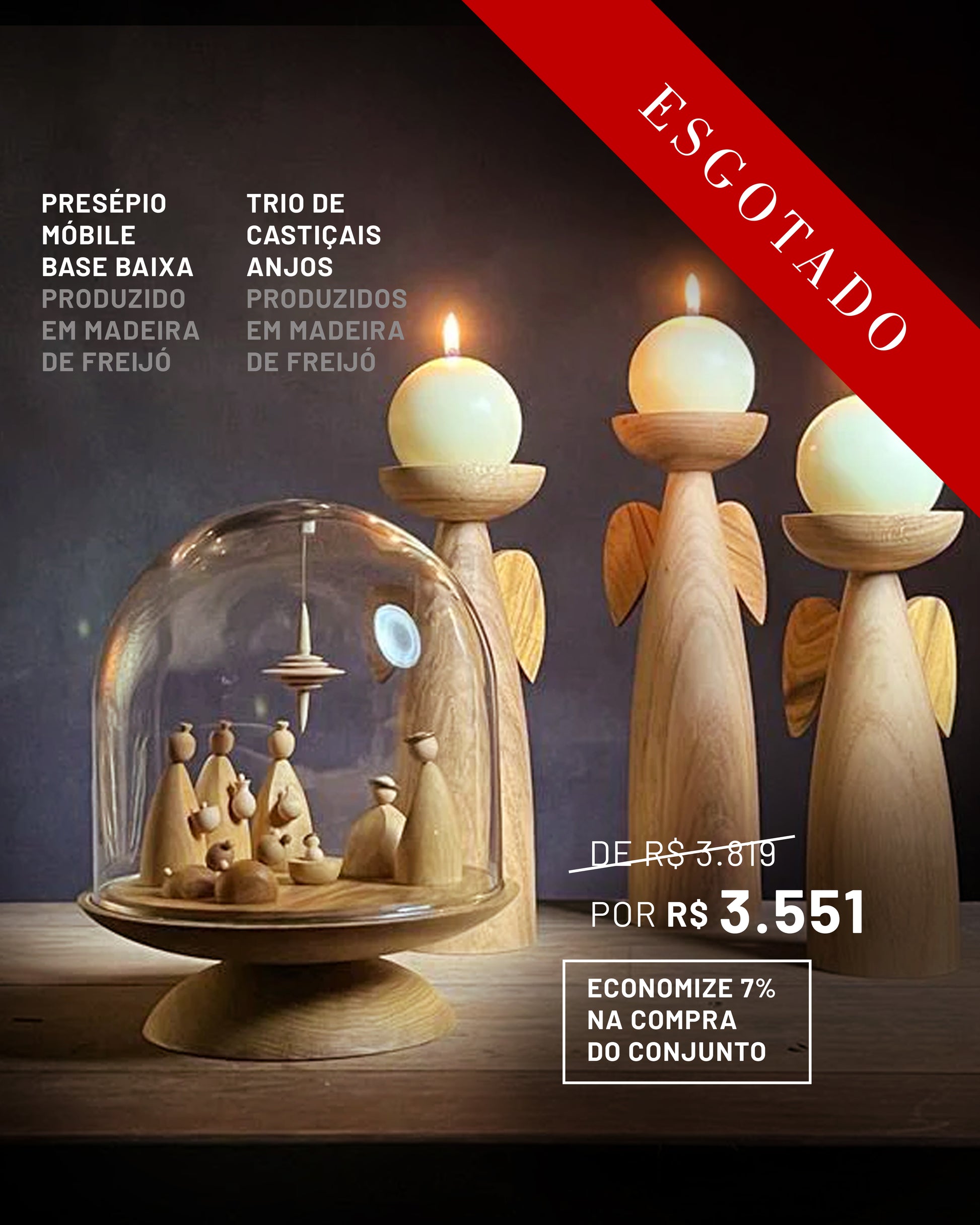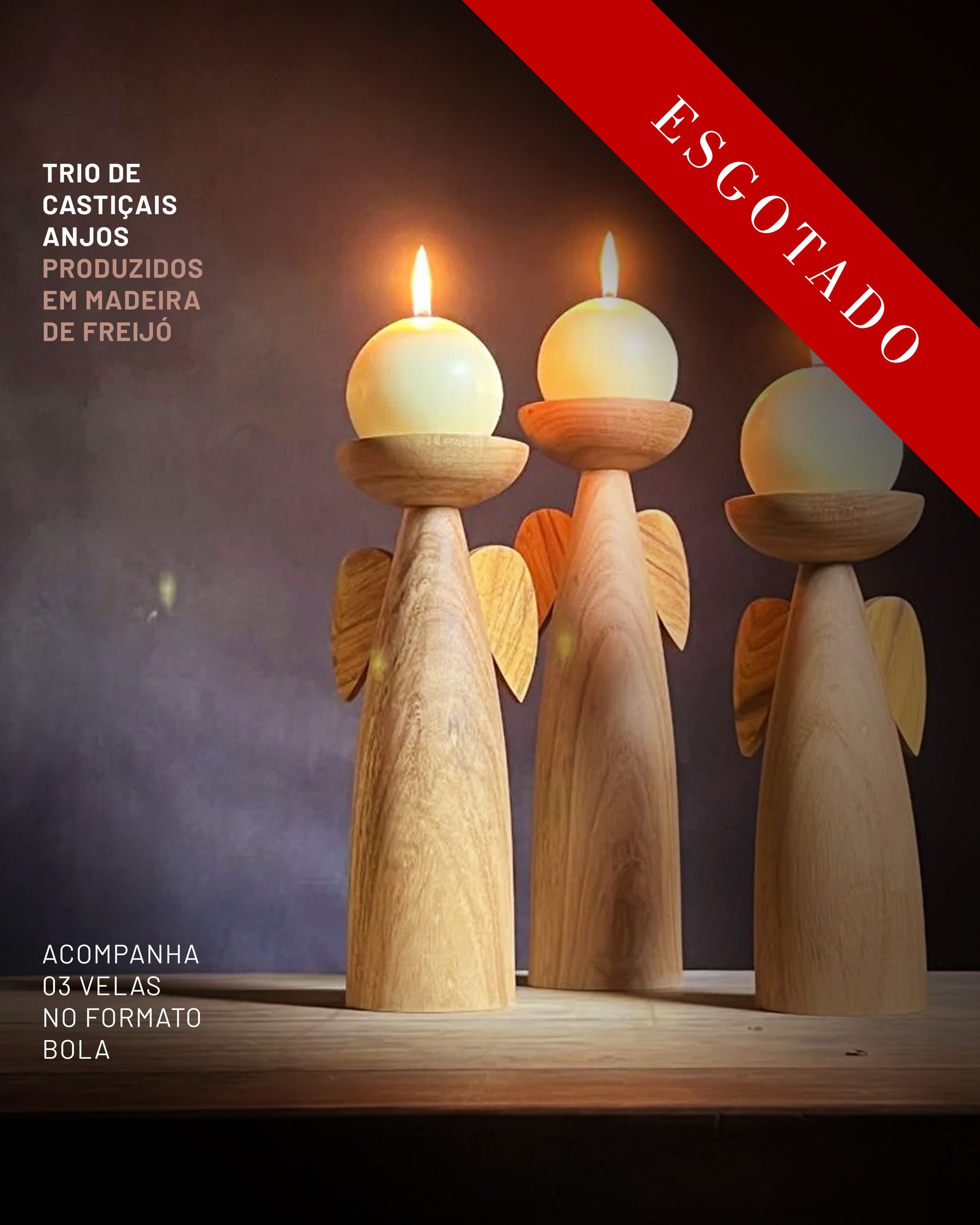 Trio de Castiçais Anjos produzidos em madeira de freijó. Acompanham 3 velas no formato bola.
