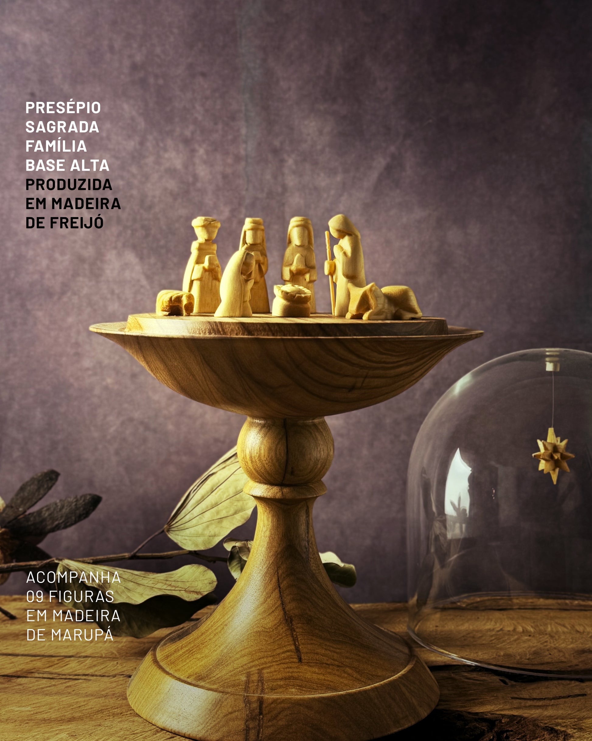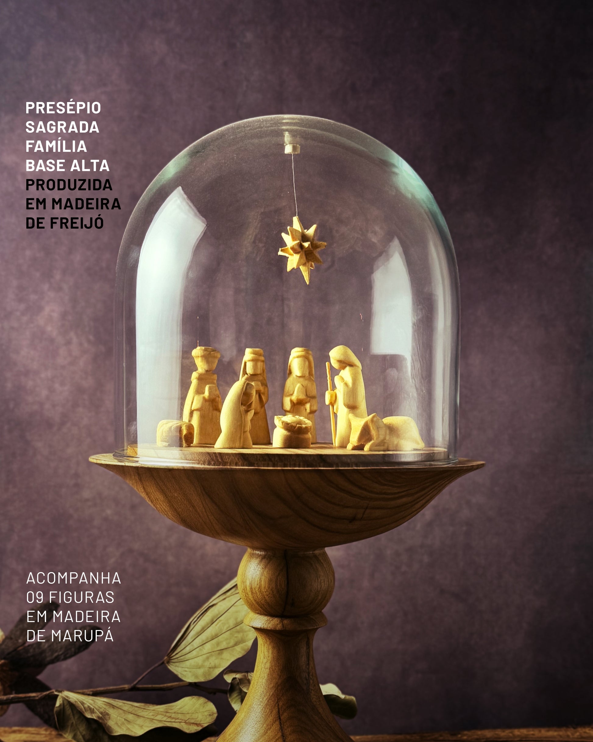 Redoma produzida em madeira de freijó, cúpula em vidro, presépio produzido em madeira de marupá composto de 1 estrela, 3 Reis Magos, 1 Maria, 1 José, 1 Menino Jesus, 1 ovelha e 1 vaca.