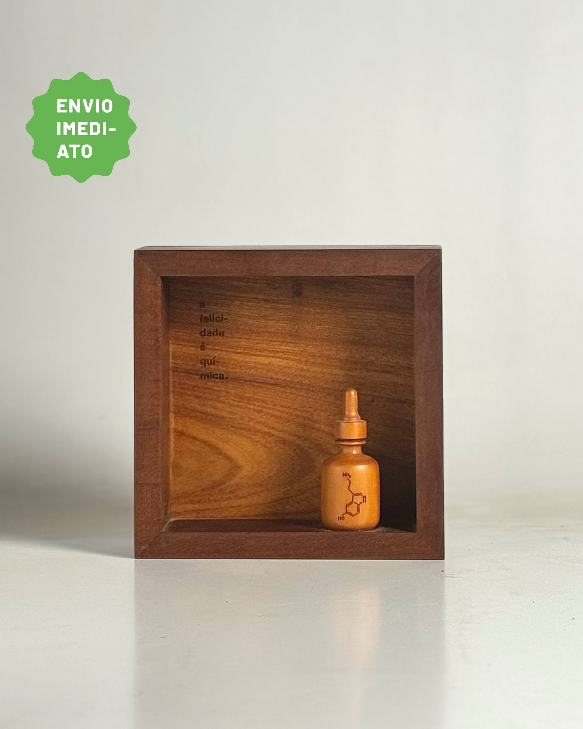 Produzido em madeiras de imbuia (moldura), freijó (fundo) e maracatiara (frasco), com gravação a laser.