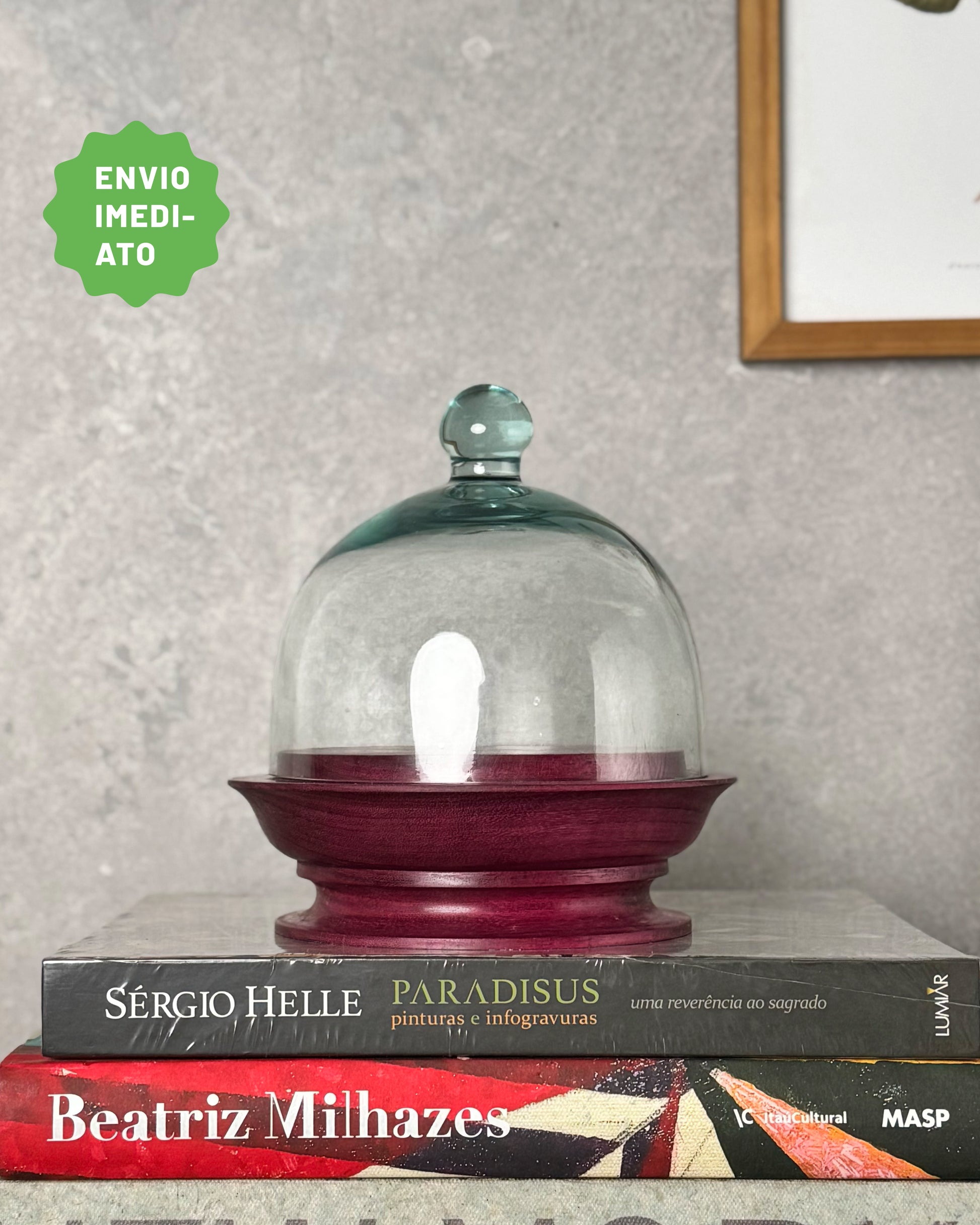 Produzida em madeiras de roxinho. Cúpula produzida artesanalmente em vidro soprado. Por isso é natural que a peça apresente pequenas imperfeições próprias dessa técnica.