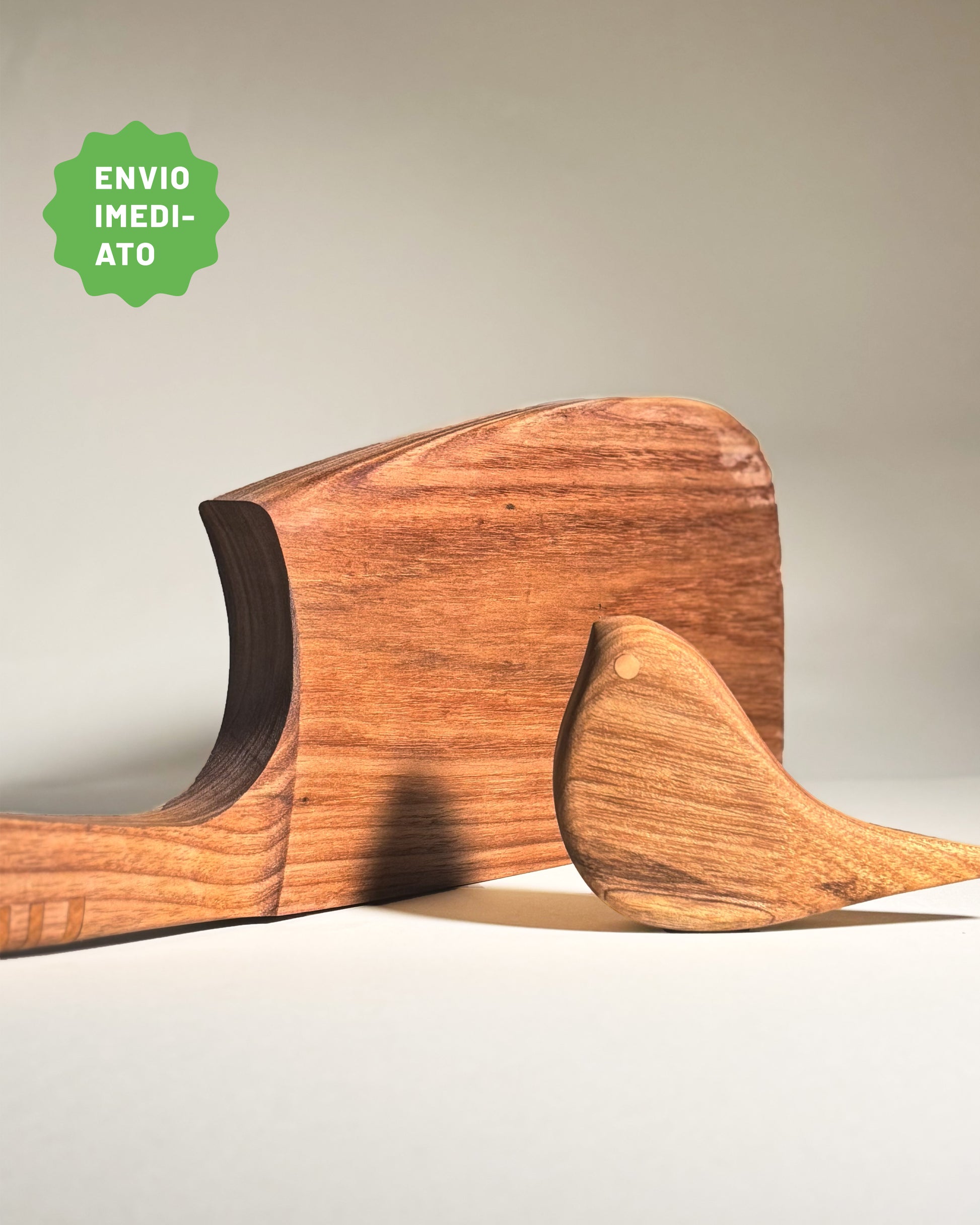 " Ao cortar o cabo da Tábua Mar, percebi que a sobra de madeira resultava naturalmente na forma de um passarinho, como se ele já estivesse ali esperando para ser solto. As duas peças são amigas inseparáveis e não são vendidas separadamente."