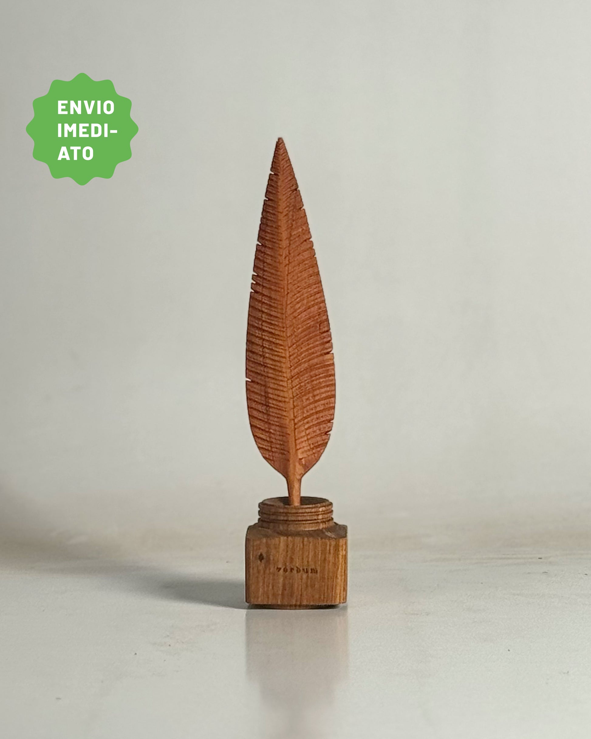 Pena produzida em madeira de pinho-de-riga. Tinteiro produzido em madeira de freijó, com gravação a laser.